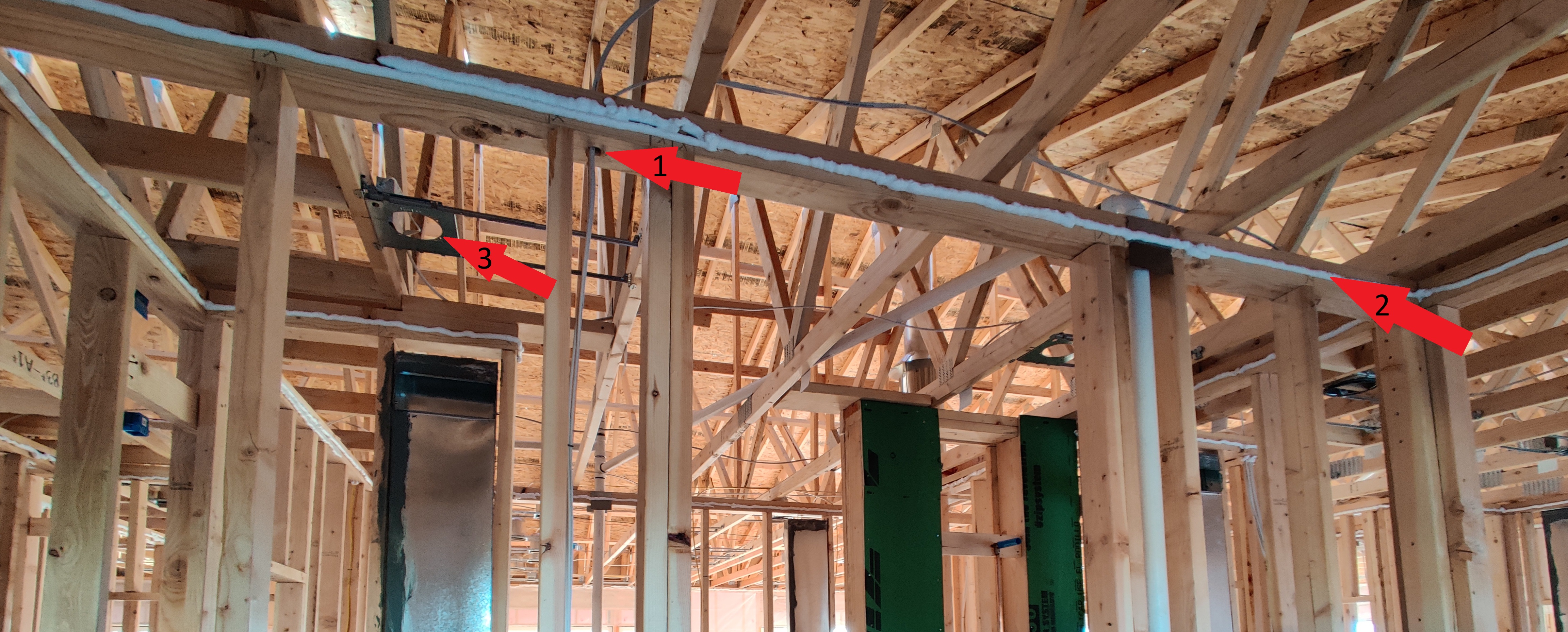 At the top of every exterior wall, the framing meets the ceiling plane. This junction is rarely airtight. Electrical wires pass through it. Plumbing vents pass through it. The framing members themselves may have gaps where they don't land squarely. In a home with an unconditioned attic (most homes), this is the boundary between conditioned living space and the attic that will be at least 10-20°F hotter than outside in July and about the same temperature as the outside in January. An unsealed top plate lets that unconditioned air directly into your wall cavities and insulation. It is standard practice to seal all penetrations in the top plate, but that does not address the gaps between the sheathing and the top plate or the drywall and the top plate. Air will still pass through those places around the insulation.